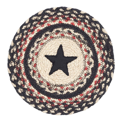 The Revere Braided Trivet Stencil Star 8" sets the primitive table beautifully with alternating black, natural and bright red braids. An appliqued black 5-point star in the center complete the look.