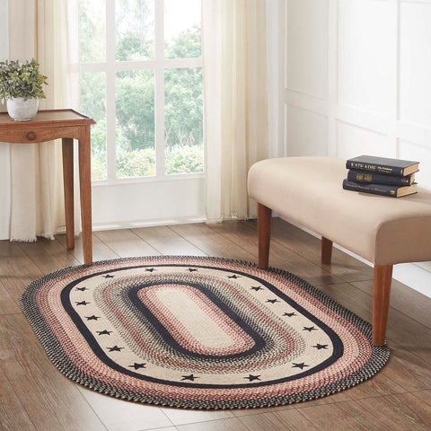 Create that warm coziness into your country home with the area Revere Oval Braided Rug. Featuring variations of Natural, Country Black, and Bright Red jute braids. Appliqued black 5-point stars are proudly displayed.