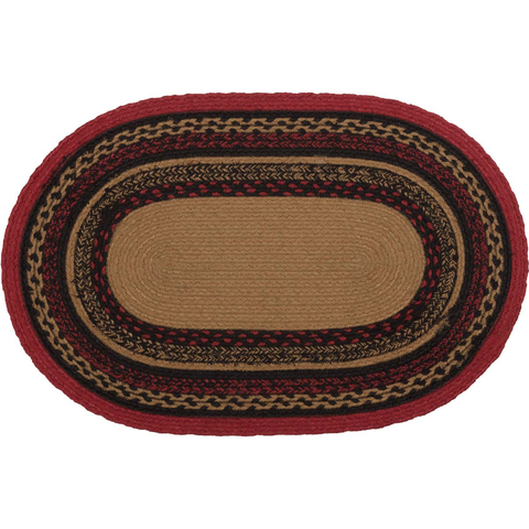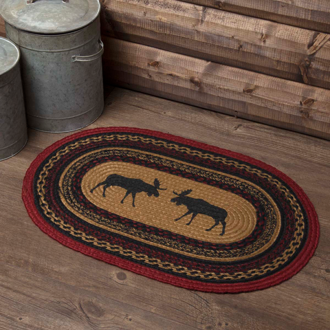 Add rustic style with bold, cabin-worthy colors in a curl-resistant jute blend that adds style and safety anywhere a small accent rug is needed. The Boone Trace Stenciled Moose Braided Jute Rug measures 20x30 inches and features a classic oval shape and tight braids constructed with a durable jute blend. The special blend relaxes faster and stays flat. Features a blend chili pepper red, caviar black and highlights of natural tan with a central moose design in black for a dark, rustic look that complements a wide array of classic country and lodge decor.