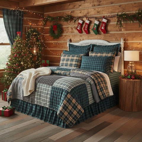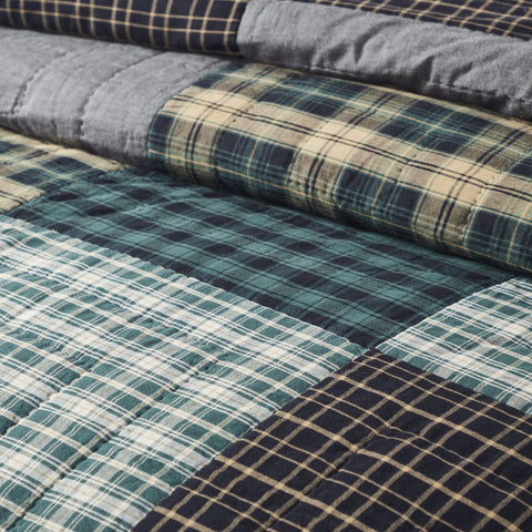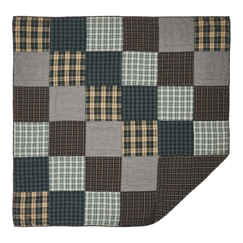 Enhance the look of your country bedroom with the Pinehurst Quilt. This quilt features a patchwork of pine green and black for a classic rustic, country look. Contains stitch in the ditch and echo quilting that guarantees natural durability to wear and tear. 100% cotton batting spread throughout this rustic quilt ensures warmth and comfort for years to come. Reverses to a soothing plaid design for an additional decor option.