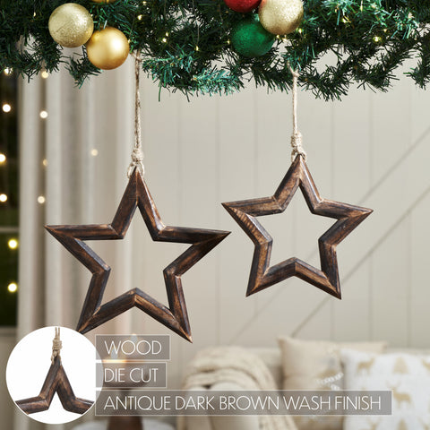 Add a timeless rustic touch to your holiday decor with the Dark Wooden Star Ornament Set of 2. Crafted from tropical wood and stained in a rich dark brown finish, each ornament features a classic star cutout design in two distinct sizes. The natural grain and smooth contours give them a simple, handcrafted feel, perfect for evoking the warmth of traditional Christmas styling. Each star ornament comes with a sturdy twine hanger, making them easy to display on Christmas trees, wreaths, mantels, or along decorative garlands. The understated solid color and clean silhouette make these stars versatile additions to both cozy farmhouse themes and more refined holiday arrangements. Their primitive charm and durable construction ensure they'll remain part of your seasonal collection year after year. Whether you're decorating a rustic cabin or adding warmth to a modern home, this set of star ornaments brings a sense of natural beauty and holiday spirit to any space. Suitable for display in the living room, dining room, entryway, or beyond, these ornaments are easy to maintain-just wipe clean with a soft cloth. Let these wooden stars shine in your home all winter long.