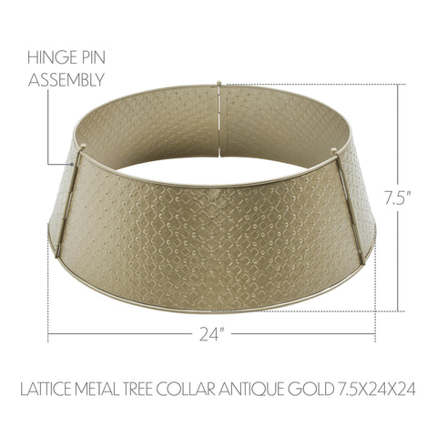 Enhance your holiday tree display with the Lattice Metal Christmas Tree Collar in a warm antique gold finish. Measuring 7.5x24 inches, this elegant tree collar features a sophisticated lattice design that adds texture and visual interest to your festive decor. The antique gold shade brings a vintage-inspired glow, perfectly suited for primitive rustic and traditional Christmas themes. Crafted from durable metal, this tree collar includes a convenient hinge pin assembly for easy installation and a secure fit around your tree base. Its solid color and classic round shape provide a polished foundation that elevates the look of any holiday centerpiece. This stylish accessory serves as a refined alternative to traditional tree skirts, blending functionality with timeless elegance. Ideal for use throughout your home-in the bathroom, bedroom, dining room, entryway, kitchen, or living room-this Lattice Metal Christmas Tree Collar adds warmth and festive spirit to any space. Maintenance is simple with a quick wipe using a soft cloth to preserve its radiant antique gold sheen year after year. This beautiful piece is a must-have for creating a cohesive and charming Christmas atmosphere.