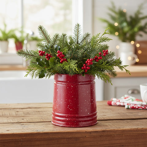 Store your utensils in farmhouse country style with our Red Speckled Enamelware Utensil Crock.  Featuring red with white speckles, it's a great vintage style functional addition for your kitchen.   It's so versatile it can be used any time of the year as a table centerpiece with a sprigs of florals.