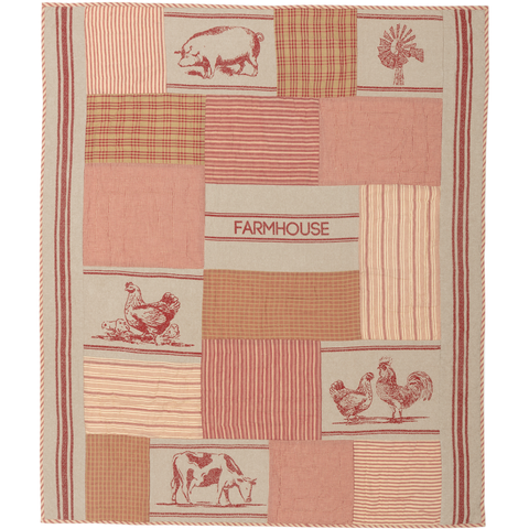 The Farmstead Red Farm Animal Quilted uses the same patterns from the Farmstead Red quilted throw featuring country red, dark tan, and creme mixed with farm animals and farmhouse themed pictures to give your space a modern country look with a touch of vintage charm.