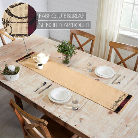Add a warm, rustic feel to your table for a cozy winter tabletop. The Boone Trace Moose Table Runner with the tan burlap base adds a textured appearance that is enhanced by applique fabric stripes in black and red plaid. The applique striping frames a mirrored stenciled design featuring black pine trees and a weathered moose silhouette. Coordinates with the Boone Trace Collection for rustic country style for your whole home.