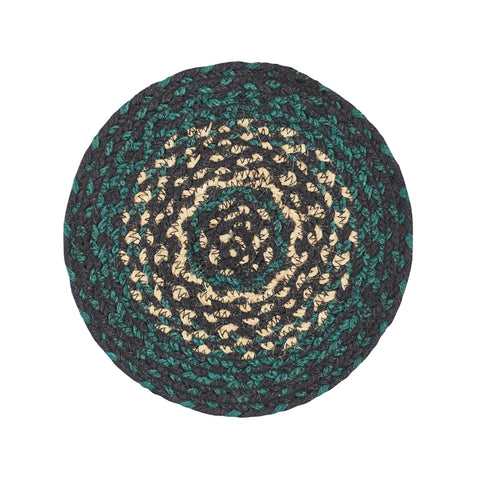 Protect your furniture in farmhouse style with our Pinehurst Braided Round Trivet 8". This 8 inch rustic table trivet is the perfect feature to stop heat from hot pots and pans from destroying a valued table or countertop. The homemade feel comes to life with the woven braided jute wool blend fabrics in pine green, natural and black displayed in concentric circles. Sold individually.