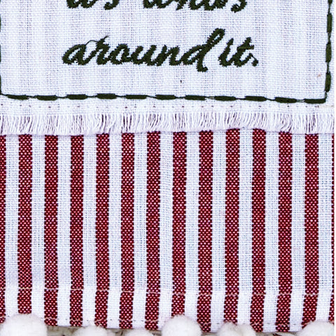 Welcome the Christmas season into your home with our It's Who's Around It Patch Dishtowel. Featuring red and white stripes with white pom accents and catchy phrase "It's not what's under the tree that matters, it's who's around it".