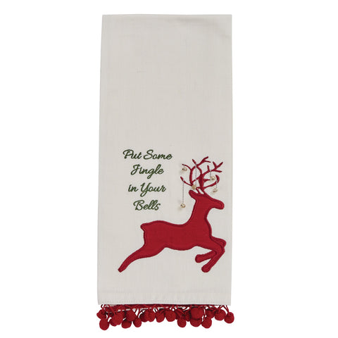 Welcome the Christmas season into your home with our Reindeer Jingle dishtowel. Features a red reindeer with actual jingle bells hanging from its antlers and a red pom bottom.