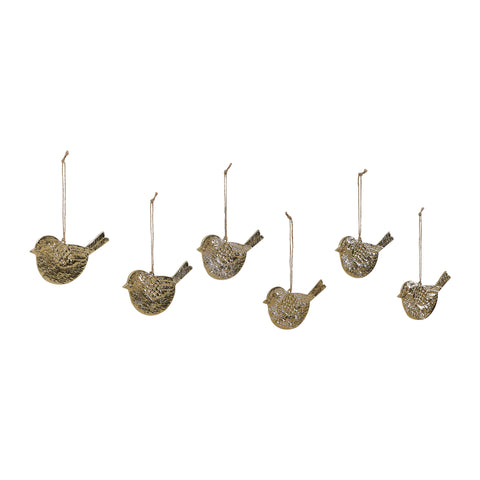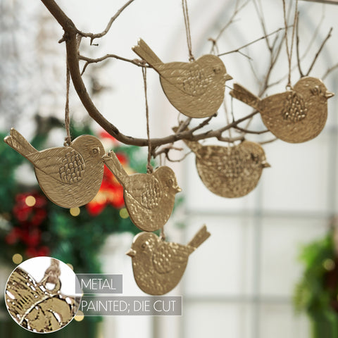 Bring vintage elegance and rustic charm to your holiday decor with the Finch Metal Ornament Set of 6. Crafted from sturdy iron, each ornament features a detailed finch bird with intricately sculpted feathers and facial features. Finished in a rich dark gold tone and paired with a twine hanger, these ornaments offer a timeless, handcrafted look perfect for primitive and country-inspired Christmas themes. The solid color and painted finish give these ornaments a subtle shimmer that catches the light beautifully, making them ideal for decorating Christmas trees, garlands, or seasonal centerpieces. Their nature-inspired design adds a peaceful, woodland element to your holiday setting, while the warm gold hue complements both traditional and modern rustic decor styles. Perfect for use in the bathroom, bedroom, dining room, entryway, kitchen, or living room, this set of six finch ornaments adds a natural and sophisticated touch to any space. Whether displayed together or spread throughout your home, they bring warmth, texture, and a bit of festive nostalgia to your seasonal decorations. To maintain their beauty, simply wipe clean with a soft cloth.