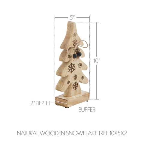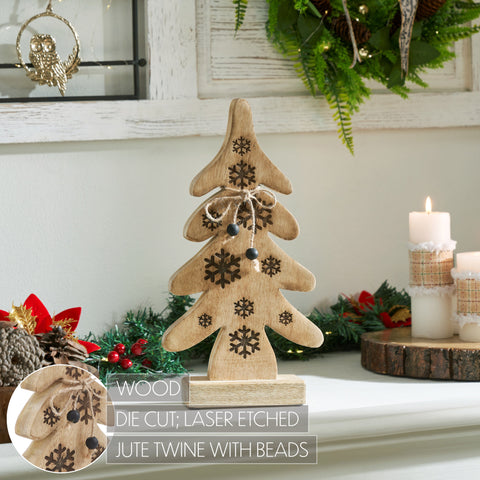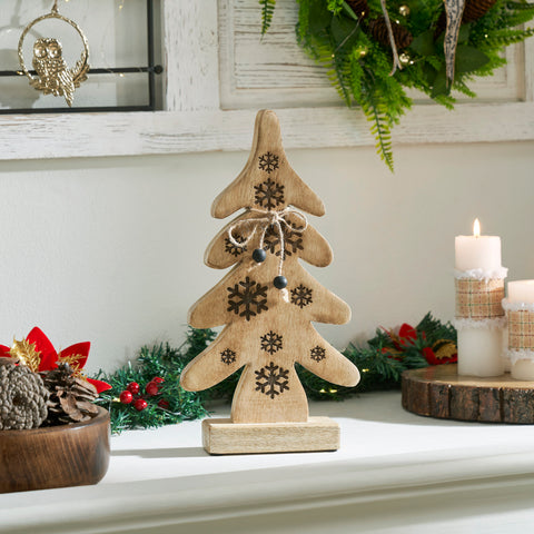 Add rustic charm to your winter decor with the Wooden Snowflake Tree. This decorative figurine features a simple tree silhouette crafted from tropical wood in a natural wood tan finish. Dark brown carved snowflakes are etched across the surface, creating a festive and handcrafted look that captures the quiet beauty of the season. A twine tie with small wooden beads accents the tree's base, enhancing its country-style appeal and adding texture to the design. Mounted on a sturdy wooden base, this figurine is perfect for display on mantels, tabletops, or shelves, offering a cozy touch to farmhouse, rustic, or traditional winter themes. Its compact size makes it easy to incorporate into any seasonal arrangement. Designed for use in any room-bathroom, bedroom, dining room, entryway, kitchen, or living room-the Wooden Snowflake Tree brings natural warmth and festive elegance to your home. Durable and easy to maintain, simply wipe clean with a soft cloth to keep it looking its best year after year. It's a timeless piece that brings the spirit of winter indoors with subtle charm.