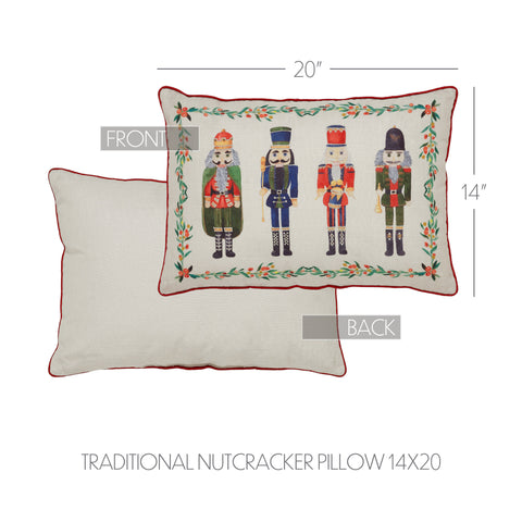 Add a festive touch to your home with the Traditional Nutcracker Pillow, a charming accent for your Christmas and winter decor. This decorative pillow features four classic nutcrackers standing proudly in colorful suits of green, red, and blue, each full of character and holiday spirit. Set against a warm dark creme polyester base, the vibrant print brings nostalgic joy and seasonal flair to any space. A printed border of evergreen branches and cheerful red Christmas berries frames the nutcrackers, giving the design a finished and festive look. Red piping around the edge adds a pop of contrast and enhances the traditional appeal. The pillow's rectangular shape makes it versatile for styling on sofas, armchairs, or beds throughout your home. Perfect for the living room, bedroom, or entryway, this pillow complements rustic and primitive holiday themes with ease. Made from soft cotton and spot clean only, it combines comfort with seasonal style. Whether you're hosting guests or simply enjoying a cozy night in, this pillow helps set the scene for a joyful Christmas atmosphere.