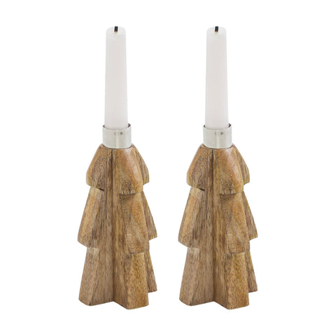 Bring warm, rustic charm to your seasonal decor with the Tree Wooden Taper Candle Holder Set of 2. Crafted from tropical wood, these unique candle holders are shaped like stylized trees in a light natural tan finish. At the top of each tree sits a sleek silver metal insert designed to securely hold a standard taper candle, blending natural textures with metallic contrast. The solid wood construction and clean silhouette give these holders a primitive, handcrafted appeal that's perfect for winter and holiday decorating. The mix of wood and metal offers a balanced, organic look that works well with farmhouse, rustic, or minimalist interiors. Whether displayed on a mantel, dining table, or entryway console, they add understated elegance to any space. Ideal for use in the bathroom, bedroom, dining room, entry, kitchen, or living room, this set of candle holders offers a versatile accent for the season. The neutral tones make them easy to style with other Christmas and winter decorations. For lasting beauty, simply wipe clean with a soft cloth after each use.