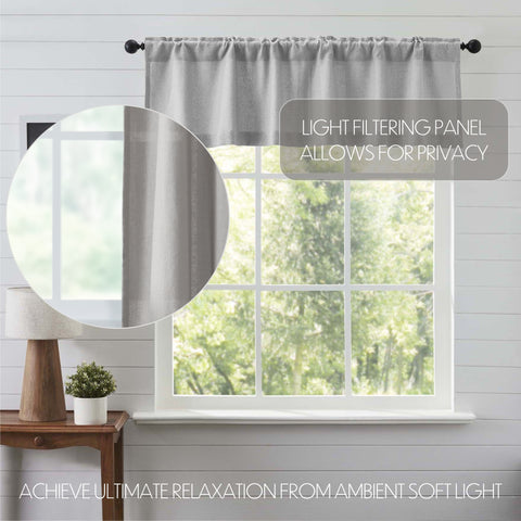 - Light Filtering — Unlined with a loose weave appearance, this grey valance curtain lets in light without being sheer. Place in your home to provide a little privacy from neighbors or those passing by while allowing the sunshine to brighten your living space.