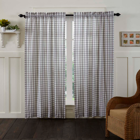 The Grace Ann Buffalo Grey Check Panel Set supplies fresh and lighthearted curtains tailored to complete the look of your laid-back farmhouse decor. Crisp grey and antique white buffalo checks create a modern yet relaxed country feel in your home. Place these drapes in the living room, dining room or bedroom to enhance your style. These 100% cotton curtains have a white lining to keep away the sun's glare and have a rod pocket for simple hanging. Includes two matching tie backs.