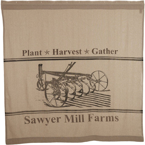 - This shower curtain contains the large stenciled words "Plan, Harvest, Gather" and "Sawyer Mill Farms" in distressed brown, accented with grain sack stripes.