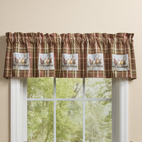 Add farmhouse flair to your room with Our Sexton Chicken Valance.  It features appliqued row of chickens surrounded by the catchy plaid background.