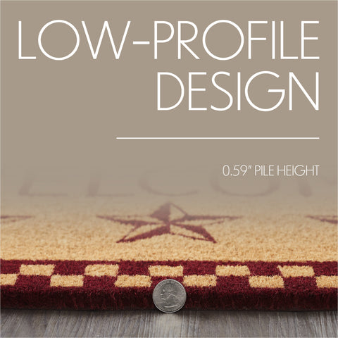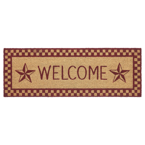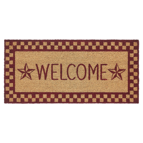 Welcome guests with the charming Bedford Burgundy Check Stars Coir Welcome Rug. This delightful doormat features a bold "Welcome" message adorned with rustic barn star accents, all beautifully enclosed by a burgundy checkered border. Set against a warm natural tan background, this rug adds a cozy touch to your entryway, making it a perfect fit for country or primitive-style homes. The Rug is designed to fit perfectly at your doorstep, while the non-slip PVC backing ensures stability, preventing slips and keeping the mat securely in place, even in high-traffic areas. The traditional checks and stars design creates a welcoming atmosphere that resonates with warmth and charm.