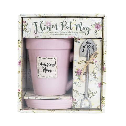 Our Flower Pot Mugs are customer favorites! Mugs come packaged in a cute gift box measuring 6.625" x 7.5" x 4.625" and contain a mug, saucer and spoon. Mug is 4.625" tall, holds 14 oz. and features inscription "Awesome Mom" Coordinating saucer doubles as a lid to keep your drink warm. Stainless steel garden spade spoon is 5.5" x 1.375" and features scripture verse 1 Chronicles 16:10 "Let Your Heart Rejoice" Makes a great gift for all the gardeners and Christian women in your life.