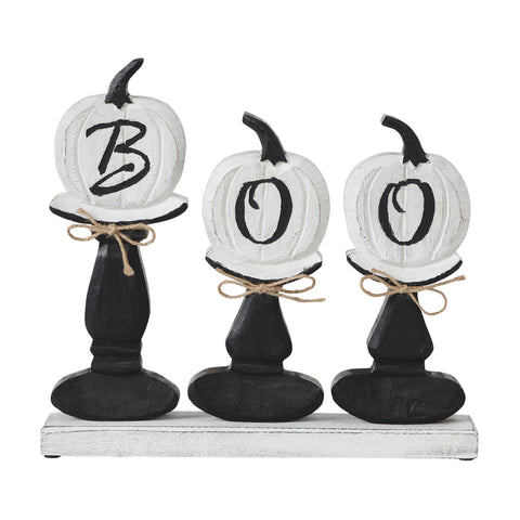 Bring a playful and rustic touch to your Halloween decor with the BOO Pumpkins Wooden Table Sign. This 12.5x13.5 inch figurine features three white pumpkins, each carved with one letter of the word BOO. Each pumpkin sits on a black pedestal with a twine bow, and all three pedestals are securely attached to a single white base, making it easy to move around your home and display it in various settings. Crafted from durable tropical wood, this wooden table sign brings a charming, primitive look to your fall and Halloween decor. The rustic black and white color palette, along with the carved and painted graphics, gives it a timeless, vintage-inspired feel that complements farmhouse or country-style interiors. The twine accents add a touch of warmth, enhancing the overall rustic aesthetic of the piece. The BOO Pumpkins Wooden Table Sign is perfect for adding a festive spirit to any room in your home, whether placed on a mantel, dining table, entryway, or living room shelf. This versatile decor item adds a welcoming Halloween vibe with its playful design and sturdy construction. Use it to celebrate the season year after year, bringing both style and fun to your autumn and Halloween displays.