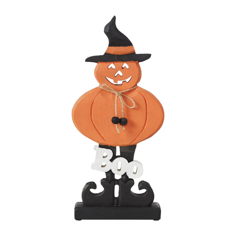 Bring some whimsical Halloween charm to your home with the Boo Wooden Jack-O-Lantern. Measuring 7.25x15.5 inches, this delightful figurine features a pumpkin-shaped body and round, smiling Jack-O-Lantern head in vibrant pumpkin orange. Topped with a classic black witch's hat, this piece is adorned with the word Boo carved across the knees and above his boots, which feature whimsical curled toes, adding a fun, spooky touch to your fall decor. Crafted from durable tropical wood, this painted figurine combines rustic and primitive style with Halloween flair. The contrasting colors of pumpkin orange, deep black, and white make it a striking addition to your tabletop displays. Whether placed in the living room, dining room, or entryway, this cheerful Jack-O-Lantern adds both charm and a playful spirit to any room during the Halloween season. The Boo Wooden Jack-O-Lantern is perfect for bringing a festive and lighthearted vibe to your fall and Halloween decor. Its unique design makes it a fun focal point for mantels, shelves, or tabletops. Easy to clean with a soft cloth, it is a versatile and timeless piece that will enhance your Halloween displays for years to come.