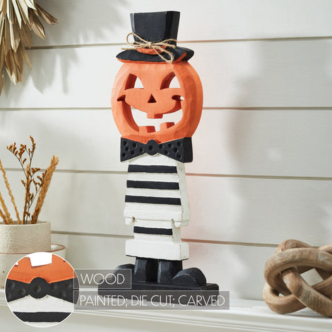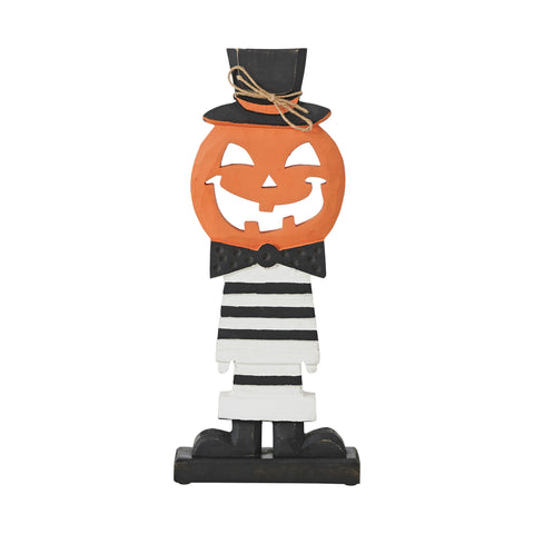 Add a playful touch to your Halloween decor with the Fancy Wooden Jack-O-Lantern. Measuring 7.5x17.5 inches, this whimsical figurine features a grinning Jack-O-Lantern dressed in a fun, prison-striped outfit complete with a black top hat, bow tie, and black boots. The bright pumpkin orange color, contrasted with deep black and bright white accents, creates a striking and humorous focal point for your fall and Halloween displays. Crafted from durable tropical wood, this Jack-O-Lantern is painted with vibrant, bold colors and designed to stand out in any room. The unique design, with its playful nod to an escaped character, adds a lighthearted touch to your seasonal decor.