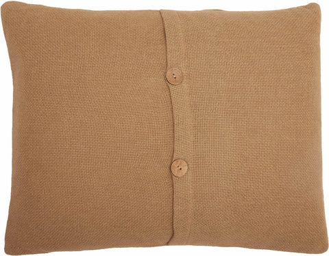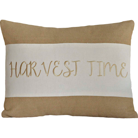 The Harvest Time Pillow comes filled and is a soft natural cotton burlap with a creme cotton canvas. The wording is shown across the appliquéd strip in the center center.
