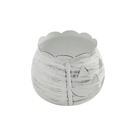 Invite the warm, timeless embrace of autumn into your home with our Jack-O-Lantern Candle Holder in Antique White. This enchanting pumpkin-shaped tealight holder, meticulously crafted from durable metal and finished in a creamy antique white, instantly evokes the serene charm of a cozy farmhouse or a quaint cottage. Measuring a perfectly proportioned, it features a classic Jack-O-Lantern face framed by a gently scalloped rim, ready to cast a soft, inviting glow across your dining table, kitchen counter, or living room mantel. Its understated elegance and playful yet primitive design effortlessly blend with existing rustic, primitive, or farmhouse decor, making it an indispensable accent for your fall and Halloween celebrations. As dusk settles, let this charming Jack-O-Lantern become the heart of your seasonal display, filling your space with a comforting ambiance. The neutral antique white tone ensures versatile styling, complementing a vibrant array of fall foliage and festive touches.Â
