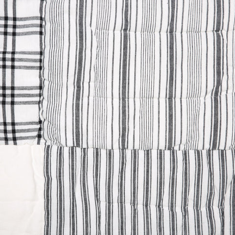 Cozy up with the farmhouse inspired Farmstead Black Block Quilted Throw 60x50. Featuring stitch in the ditch and echo hand-quilting on country black and soft white fabrics with irregular block layout in various plaid and striped Farmhouse fabrics. Reverses to a charming plaid design for an alternative country look.