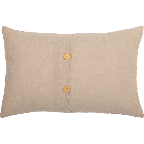 The Farmstead Red Family Pillow is the perfect addition to your country farmhouse style home. Featuring strip patchwork on the front in alternating country red, khaki, and creme fabrics containing the word "Family" appliqued in matching country red felt. This unique farmhouse pillow is finished with a turned edge seam and reverses to textured khaki chambray fabric two with light wooden button closures.