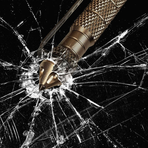 Tungsten steel tip strong enough to shatter any glass, diamond textured body for firm grip, aircraft grade aluminum body, smooth writing ballpoint tip, easy twist, standard refillable ink cartridge, no break clip to keep pen secured at all times.