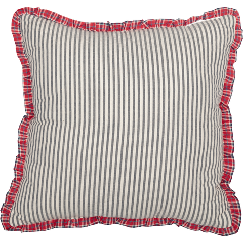 Complement your Americana decor and express your pride for love and country with the Americana Patch Star Pillow. Featuring a red, white, and blue plaid background with a blue and white check star outlined in thick cotton fabric. Finished with a ruffle around the edge to add a touch of country charm. Reverses to blue and white ticking stripes.