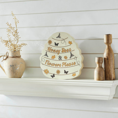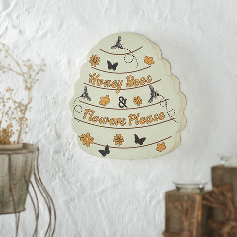 - Unique Shape: Bee hive-shaped wall decor featuring the phrase "Honey Bees & Flowers Please" with charming bee, butterfly, and blossom illustrations.