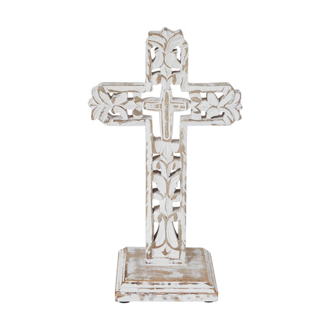 Enhance your home with a touch of serene spirituality using the Distressed White Ornate Wooden Cross with base. This decorative cross is beautifully crafted from tropical wood, known for its durability and distinctive light wood brown tone. It features an elaborate design with an inset cross at the center, surrounded by intricately carved swirls and floral motifs. The entire piece is painted in a distressed white finish, achieving a vintage look that complements both modern and traditional decor. This versatile piece can be displayed in any room, adding a meaningful touch to your living space. The cross's aesthetic draws from both farmhouse and country styles, making it an ideal addition to spaces designed with a rustic or shabby chic theme. The whitewashed finish not only highlights the detailed carvings but also enhances its spiritual symbolism, creating a peaceful ambiance wherever it is placed. Whether set against a busy backdrop in the living room, a tranquil corner of the bedroom, or welcoming guests in the entryway, this ornate wooden cross is sure to capture attention and spark conversations. Maintenance of this decorative cross is hassle-free, requiring only a soft cloth for cleaning to maintain its pristine condition. The solid base ensures stability, allowing for easy placement on any flat surface-from kitchen counters and dining room buffets to bathroom shelves. Measuring 13x7.5x5 inches, it is perfectly sized to make a significant impact without overwhelming the space. Make this Distressed White Ornate Wooden Cross a focal point in your home decor, and embrace its blend of artistic craftsmanship and spiritual elegance.