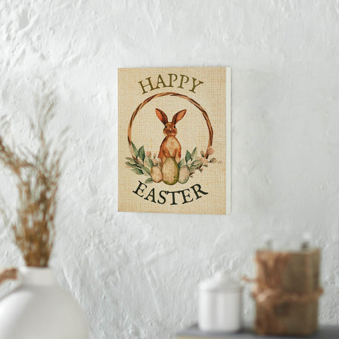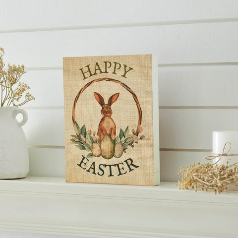 Welcome the Easter season with a touch of rustic charm using the Spring In Bloom Happy Easter Bunny & Eggs In Wreath Wall Sign. This 8x10 inch rectangular sign features a heartwarming "Happy Easter" greeting, enhanced by a whimsical depiction of a bunny surrounded by colorful Easter eggs, all set against a textured burlap print background. The digital print captures vibrant details and a timeless appeal, making it a perfect addition to your holiday decor. Crafted from durable MDF, the sign boasts a light tan base with accents in cypress green and bunny brown, reflecting a primitive, rustic style. The distressed appearance adds an authentic farmhouse touch, bringing warmth and cheer to your home. This sign is versatile enough to complement various spaces including the bathroom, bedroom, dining room, entryway, kitchen, or living room.Â