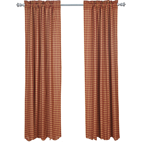 Burgundy and tan checks are blended with faded texture at points of intersection to give a modern face-lift to the country classic pattern on the Bedford Burgundy Check Scalloped Panel Set 84x40. Perfect for your country, primitive cabin and home decor.