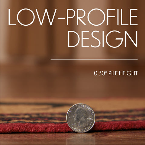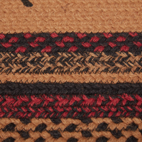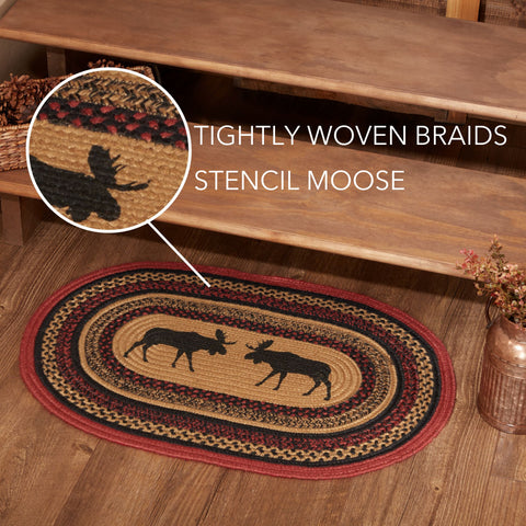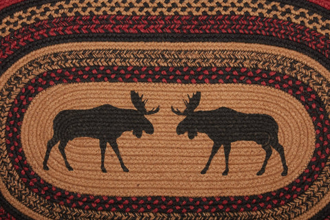 Add rustic style with bold, cabin-worthy colors in a curl-resistant jute blend that adds style and safety anywhere a small accent rug is needed. The Boone Trace Stenciled Moose Braided Jute Rug measures 20x30 inches and features a classic oval shape and tight braids constructed with a durable jute blend. The special blend relaxes faster and stays flat. Features a blend chili pepper red, caviar black and highlights of natural tan with a central moose design in black for a dark, rustic look that complements a wide array of classic country and lodge decor.