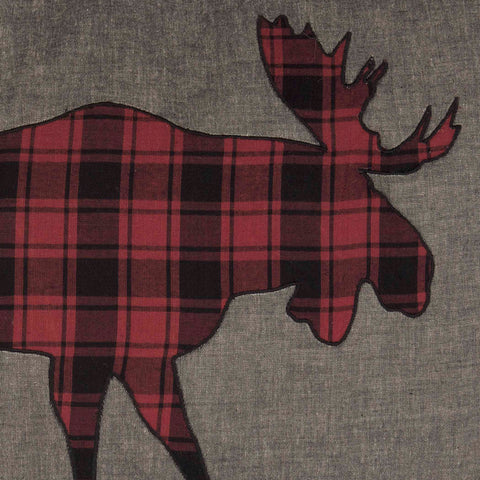 - Centered moose applique in chili pepper red and black plaid fabric on pewter chambray base