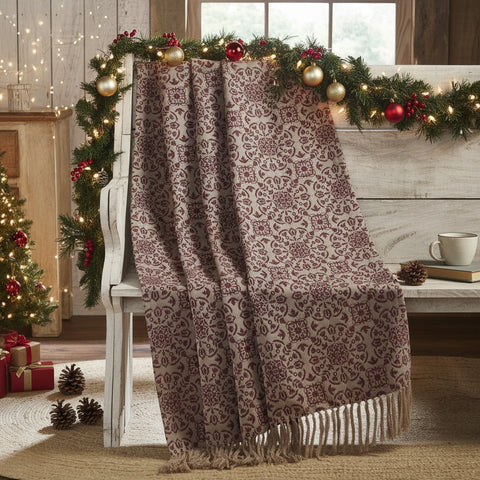 Enhance the cozy ambiance of your bedroom and living room with our Medallion Burgundy & Tan Jacquard Woven Throw. This 50x60-inch cotton blanket features a charming primitive country medallion pattern that adds a touch of timeless style. The natural hues and textured waffle weave fabric combine to create a warm and inviting atmosphere in your home. The primitive medallion design on this woven throw exudes country elegance, making it a standout piece in your decor. The textured waffle weave not only adds rustic charm but also ensures a soft and comfortable feel. Whether you're wrapping up in it for extra warmth or displaying it as an accent, this throw effortlessly complements your interior design. The Burgundy & Tan Jacquard Woven Throw offers the perfect blend of style and comfort with its intricate medallion pattern and textured waffle fabric. Whether you're snuggling on chilly evenings or using it as a decorative piece, this blanket brings character and warmth to your living space.