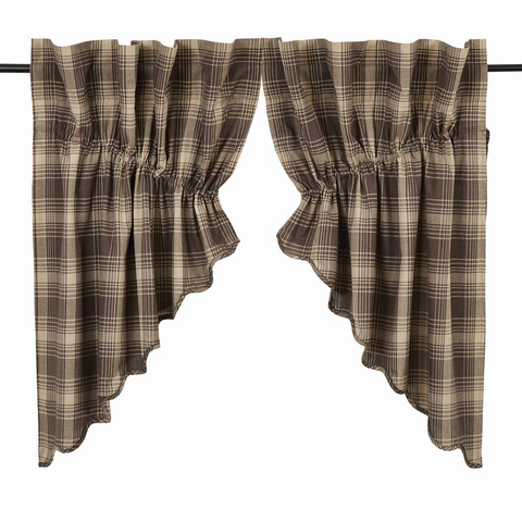 The Woodland Brown Scalloped Prairie Swag Set fully encompasses vintage lodge decor. Constructed completely from soft cotton and bursting with a dark woodland brown and tan plaid, these curtains provide a relaxed, rustic touch to your dining room, living room, or kitchen. The scalloped edging adds a classic feel, while a rod pocket and hanging loops are included for convenience. A white lining helps these swags diffuse light in your home. For design versatility, these curtains feature drawstring ties to adjust the style.