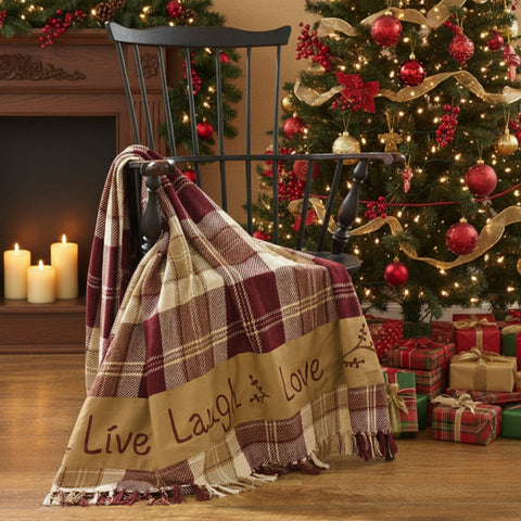 Wrap yourself in heartwarming country charm and comfort. The Linnley Live Laugh Love Throw is made of soft and durable burgundy and tan plaid fabric. It boasts tassel trim and looks darling thrown over a chair or draped on a sofa and serves as the perfect accent for a warm and inviting look any time of the year. Measures 60" high by 50" wide.