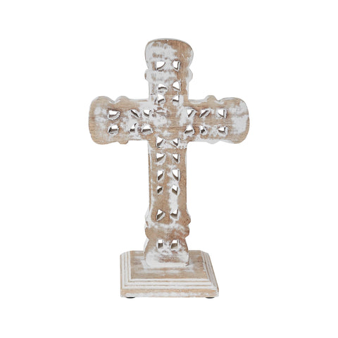 Elevate your home decor with the Brands Natural & Distressed White Wooden Cross, a striking figurine that embodies a blend of rustic charm and spiritual elegance. Crafted from robust tropical wood, this piece showcases a central, elaborately carved rosette surrounded by stunning rippling patterns, capturing both attention and admiration. The entire structure is painted in a distressed white finish, accentuating the detailed carvings and adding a vintage touch to its farmhouse style. With its solid base, this cross stands securely, making it a versatile addition to any room in your home. This decorative cross seamlessly merges elements of country design with religious art, making it an ideal choice for creating a serene and inviting atmosphere. The whitewash and wood brown tones highlight the natural beauty of the wood and the craftsmanship involved in the carved graphics, which include floral motifs that add a touch of nature to the piece. Sized at 8x13 inches, it is perfectly proportioned to serve as a significant but unobtrusive addition to a variety of spaces, from a cozy nook in the living room to a prominent display in the entryway. Maintenance of this wooden cross is straightforward and effortless, requiring only a soft cloth to wipe it clean, thus ensuring it remains a cherished part of your home decor for years to come. Whether placed in a bathroom, bedroom, dining room, kitchen, or living room, the Wooden Cross with Rosette Center enhances any decor with its artistic flair and spiritual symbolism. It not only decorates a space but also serves as a constant reminder of faith and beauty in everyday life.