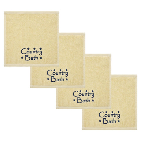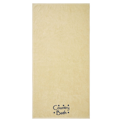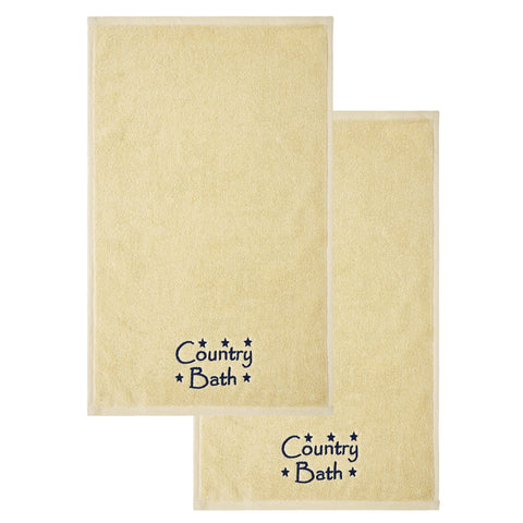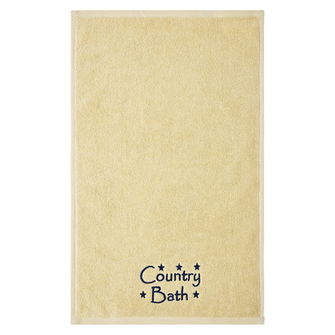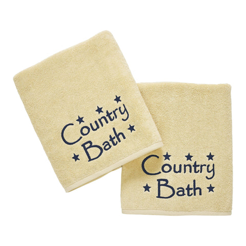 Bring a farmhouse touch to your bathroom with the Navy Country Bath Stars Creme Washcloth and Bath Towels. The washcloths and bath towels are made from soft and absorbent cotton terrycloth, providing a comfortable feel for daily use. The warm soybean creme hue serves as a neutral base, while the embroidered design at the bottom features rustic stars encircling the bold phrase "Country Bath" in navy blue, adding a charming country-inspired accent to your bathroom decor. Ideal for washing your face or adding a decorative element to your guest bathroom, these square washcloths and bath towels are both practical and stylish. The detailed embroidery, along with the soft and durable terrycloth, makes them perfect for use in a farmhouse or country-style washroom. Their classic design easily complements rustic decor, offering both functionality and visual appeal. Machine washable for easy care, the Navy Country Bath Stars Creme Washcloth and Bath Towel combine everyday practicality with rustic elegance. Whether you're looking to refresh your bathroom essentials or add a decorative touch to your space, these washcloths deliver a cozy farmhouse feel while providing the convenience and durability of high-quality cotton.