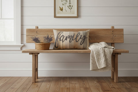 The Farmstead Charcoal Family Pillow 14x22 is the perfect addition to your country farmhouse style home. Featuring strip patchwork on the front in alternating charcoal grey, khaki, and creme fabrics containing the word "Family" appliqued in matching charcoal grey felt. This unique farmhouse pillow is finished with a turned edge seam and reverses to textured khaki chambray fabric two with light wooden button closures.