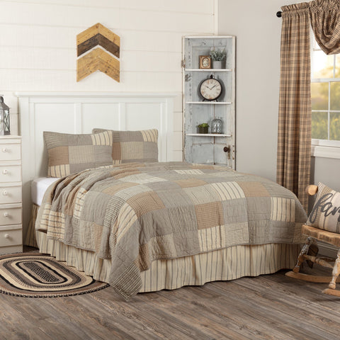 The Farmstead Charcoal Quilt's simple block pattern in various plaid and stripes work perfectly to set a Farmhouse mood for the bedroom. This cozy quilt is ash grey, creme, and black 100% cotton and echo hand-quilted for years of enjoyment. Reverses to dark creme and charcoal grain sack stripes. Shams and Pillow Cases can be purchased separately.
