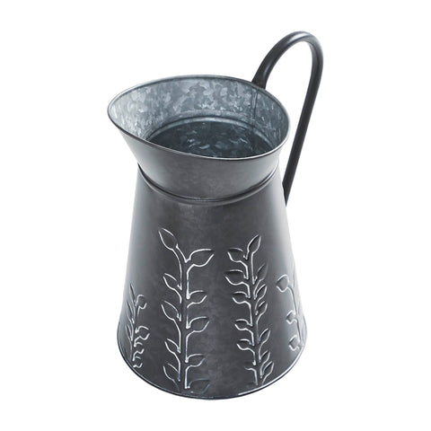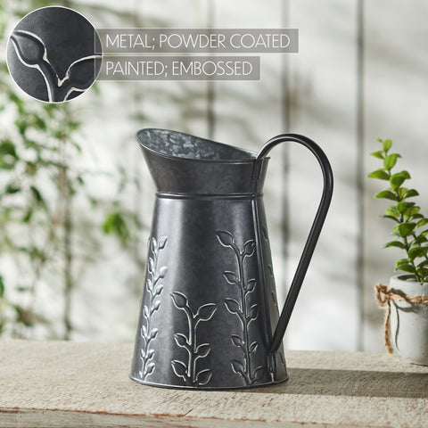 Add a touch of rustic elegance to your home decor with our Galvanized Metal Embossed Decorative Pitcher. Measuring 8.5x9 inches, this beautifully crafted metal pitcher features a rich pecan brown shade adorned with delicate embossed vines trailing up its sides. The combination of pecan brown, faded creme, and galvanized grey creates a warm, inviting aesthetic perfect for celebrating the spring season. This round decorative pitcher is designed for ornamental use only, making it an excellent choice for showcasing artificial or dried flowers. It can also be used with fresh flowers, provided it is not filled with water beyond 60% of its capacity, preserving its distressed, country garden charm. The pitcher's solid color and intricate vine details enhance its primitive and rustic style, making it a versatile addition to any room's decor. Ideal for placement in the bathroom, bedroom, dining room, entryway, kitchen, or living room, this decorative pitcher brings a hint of nature indoors with its beautiful design.Â