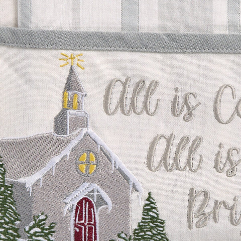 Our All Is Calm Pocket Potholder Set will add some calmness & brightness to your kitchen this holiday season. Featuring a church embroidered graphics and the words "All Is Calm All Is Bright". The decorative pot holder set also includes a dishtowel in grey and white plaid.