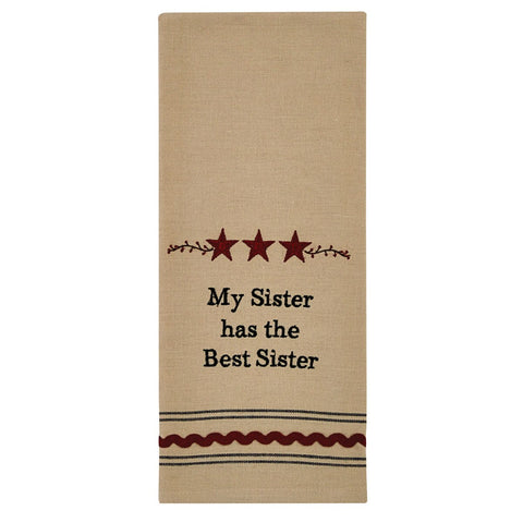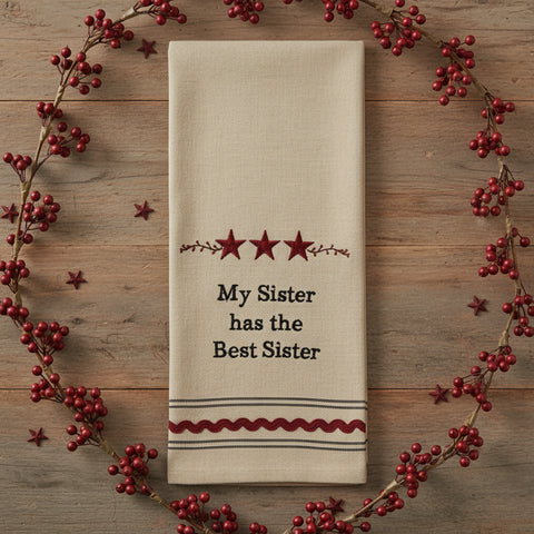Welcome the Christmas season into your home with our embroidered Best Sister Dishtowel with rick rack accents. Featuring the humorous phrase "My Sister has the Best Sister" on a tan towel.