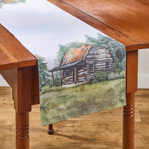Celebrate any season with the Secluded Cabin 54" Table Runner. The table runner features a beautiful cabin and wilderness design.