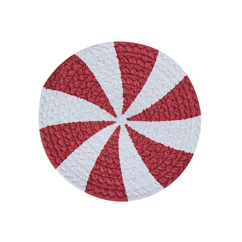 Protect your kitchen counters and table in farmhouse style with our Peppermint Candy Braided Round Trivet 8" Set of 3. This 8 inch rustic table trivet is the perfect feature to stop heat from hot pots and pans from destroying a valued table or countertop. Dress your holiday table in primitive style offering a casual aesthetic expression of primitive colors in concentric braids of 100% cotton. Machine stitching hold braiding together even with increased wear and tear. Reverses to same as front. Set of 3.