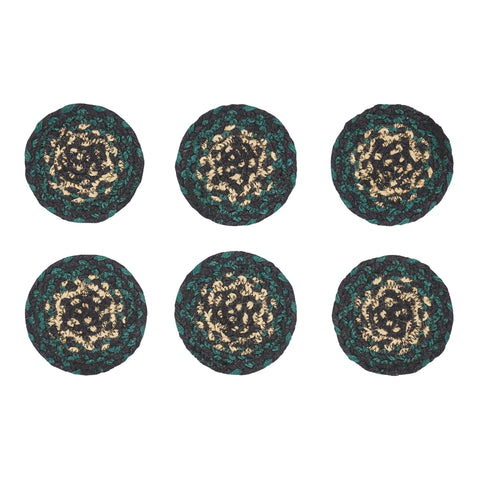Protect your furniture in farmhouse style with our Farmstead Charcoal Braided Round Coasters. This set of 6 farmhouse coasters is the down-home feature to that will safely keep your furniture away from sweat-tea glass droplets or lemonade glass rings. The homemade feel comes to life with the woven braided jute blend fabrics in asphalt charcoal, creme and grey-taupe displayed in concentric circles. These rustic coasters are perfect for any time of the year and can also be used as the foundation for a down-home display in any room where you want that burlap farmhouse feel.